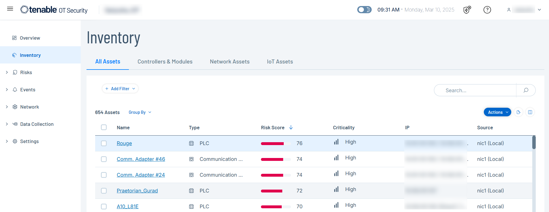 All the assets in the network appear on the Inventory pages. The Inventory page includes details about the asset that enables comprehensive asset management as well as monitoring of the status of each asset and its related events. OT Security collects this data using the Network Detection and Active Query capabilities. The All page shows data for all types of assets. In addition, specific subsets of the assets are shown on separate screens for each of the following asset types: Controllers and Modules, Network Assets, and IoT.