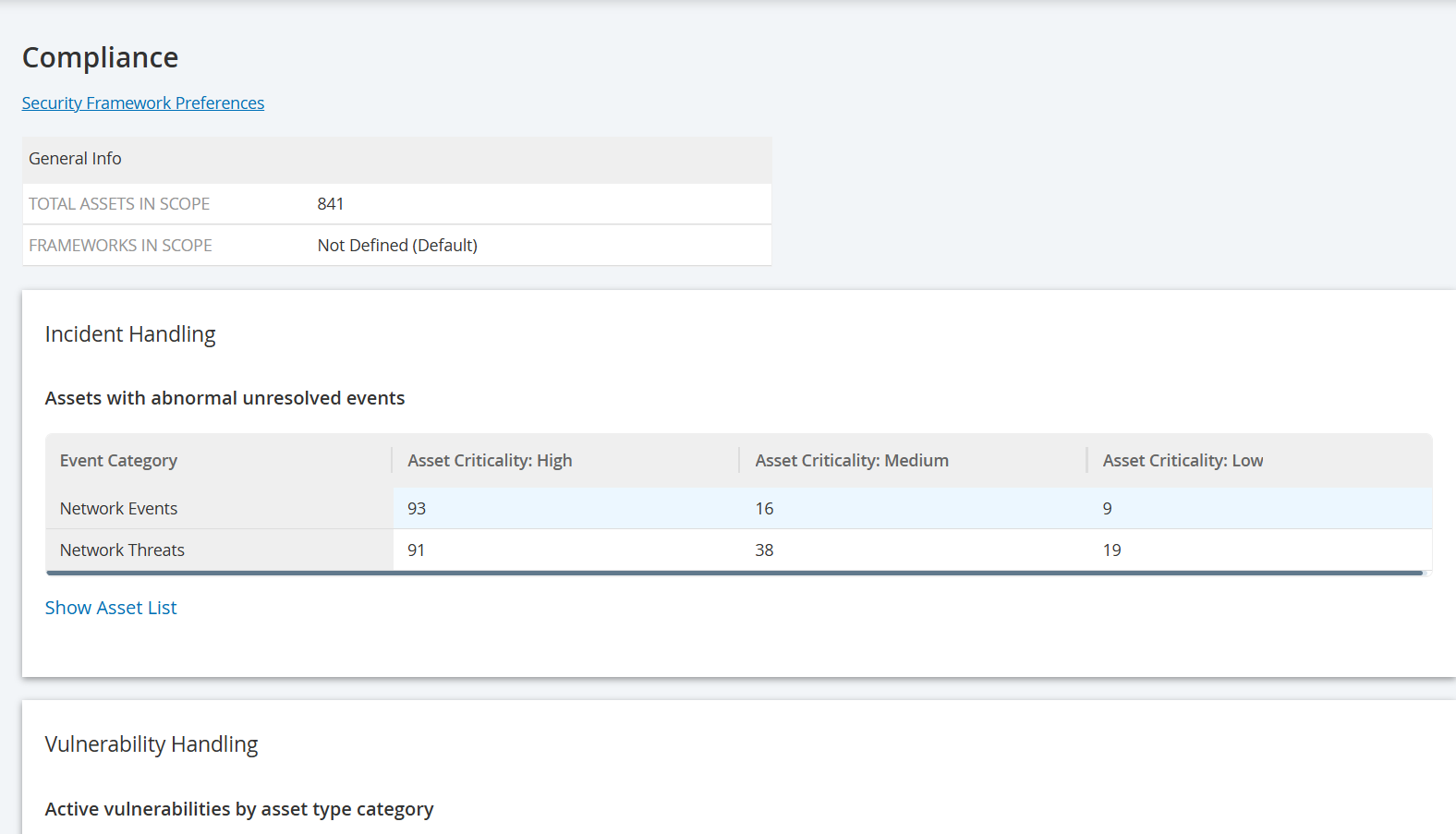 Navigating compliance frameworks can be a complex process and require specialized knowledge. Use the Compliance dashboard to get a high-level understanding of all assets, vulnerabilities, and events that might affect your organization's critical business operations and also help answer these critical audit questions: