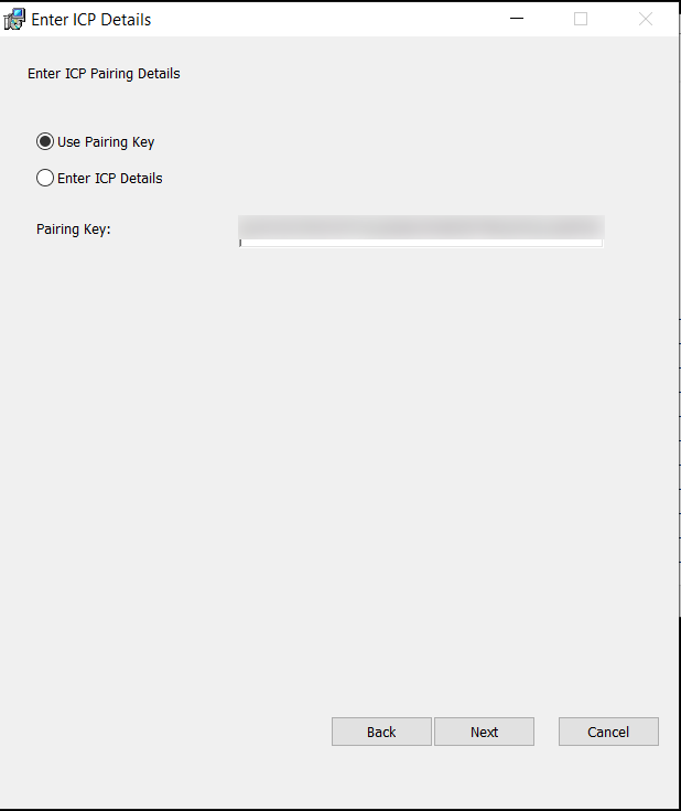 In the Pairing Key box, paste the pairing key you copied from the ICP.