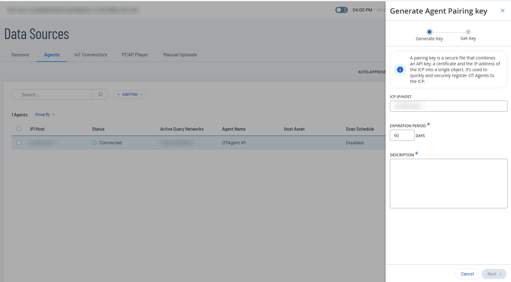PairingKey is the key that you generate from the Data Collection > Data Sources > Agents tab in OT Security.