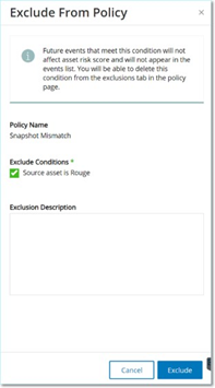 You can create exclusions from the Events page, based on events generated by your policies. You can specify which conditions of a particular event you want to exclude from the policy.