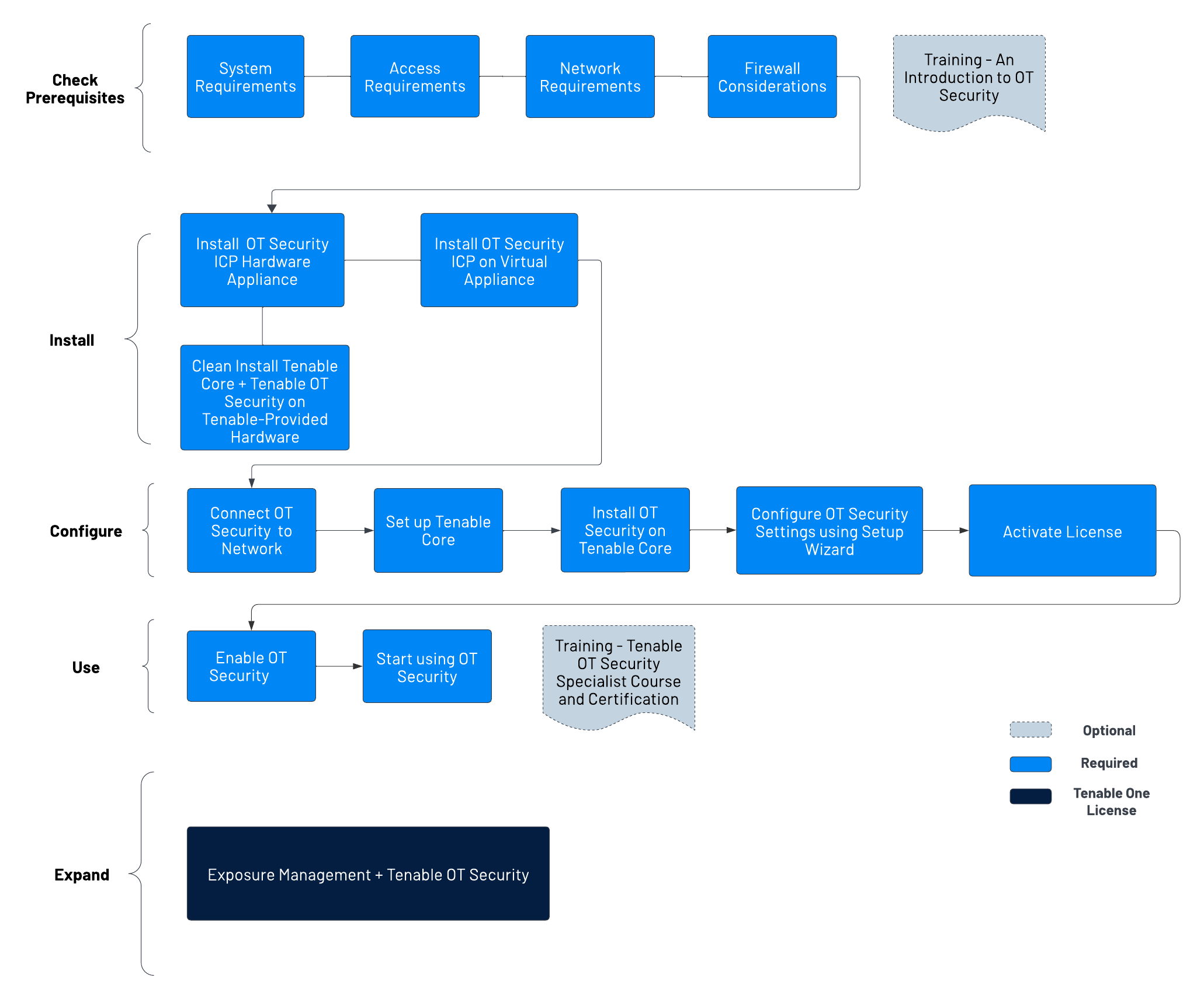 - Install OT Security ICP Hardware Appliance - Set up OT Security as a hardware appliance.Note: Tenable-provided Tenable Core hardware comes with Tenable Core+ OT Security pre-installed. If you are installing an older or dated appliance, you might opt for a clean install. For more information, see Clean Install Tenable Core + Tenable OT Security on Tenable-Provided Hardware.