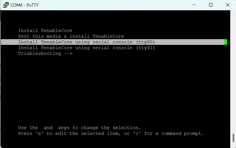 After the appliance restarts, and at the prompt, select Install TenableCore using serial console (ttyS0). This ensures that the installation output is pushed into the serial console connection of the appliance.