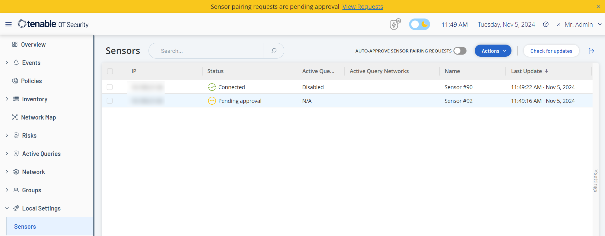 OT Security displays the new sensor in the table, and the Status shows Pending Approval.