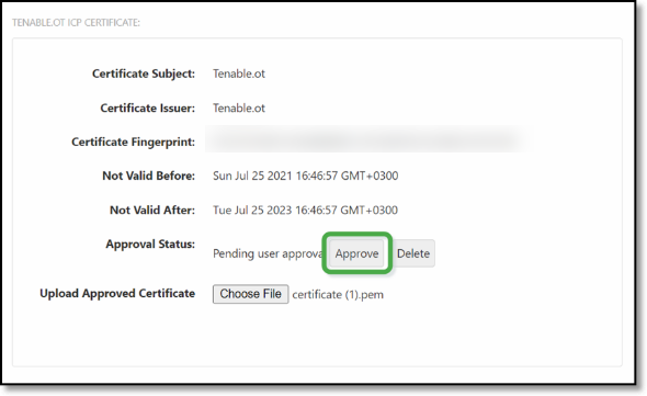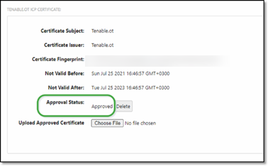 In Tenable Core, in the Tenable ICP Certificate section, under Approval Status, wait for the certificate information to load.