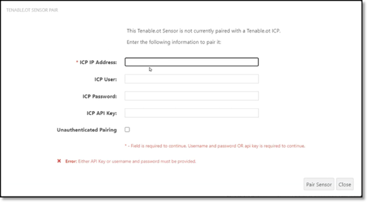 Note: The Tenable OT Security Sensor Pair window only appears the first time the page loads. To open the window after this, click the