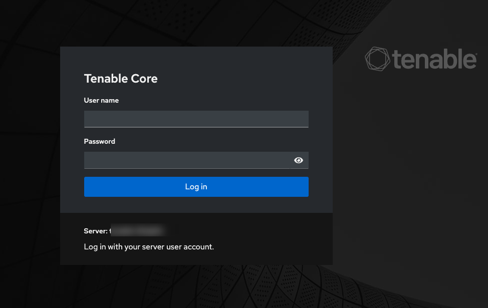 In the Tenable Core console login window, type your Username and Password, select the Reuse my password for privileged tasks checkbox, and click Log In.