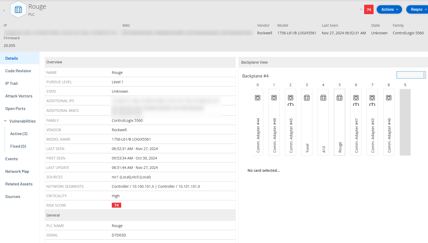 For assets that are connected to a backplane, there is also a Backplane View section, which shows a graphic representation of the backplane configuration, including the slot position of each connected device. Select a device to show its details in the lower pane.