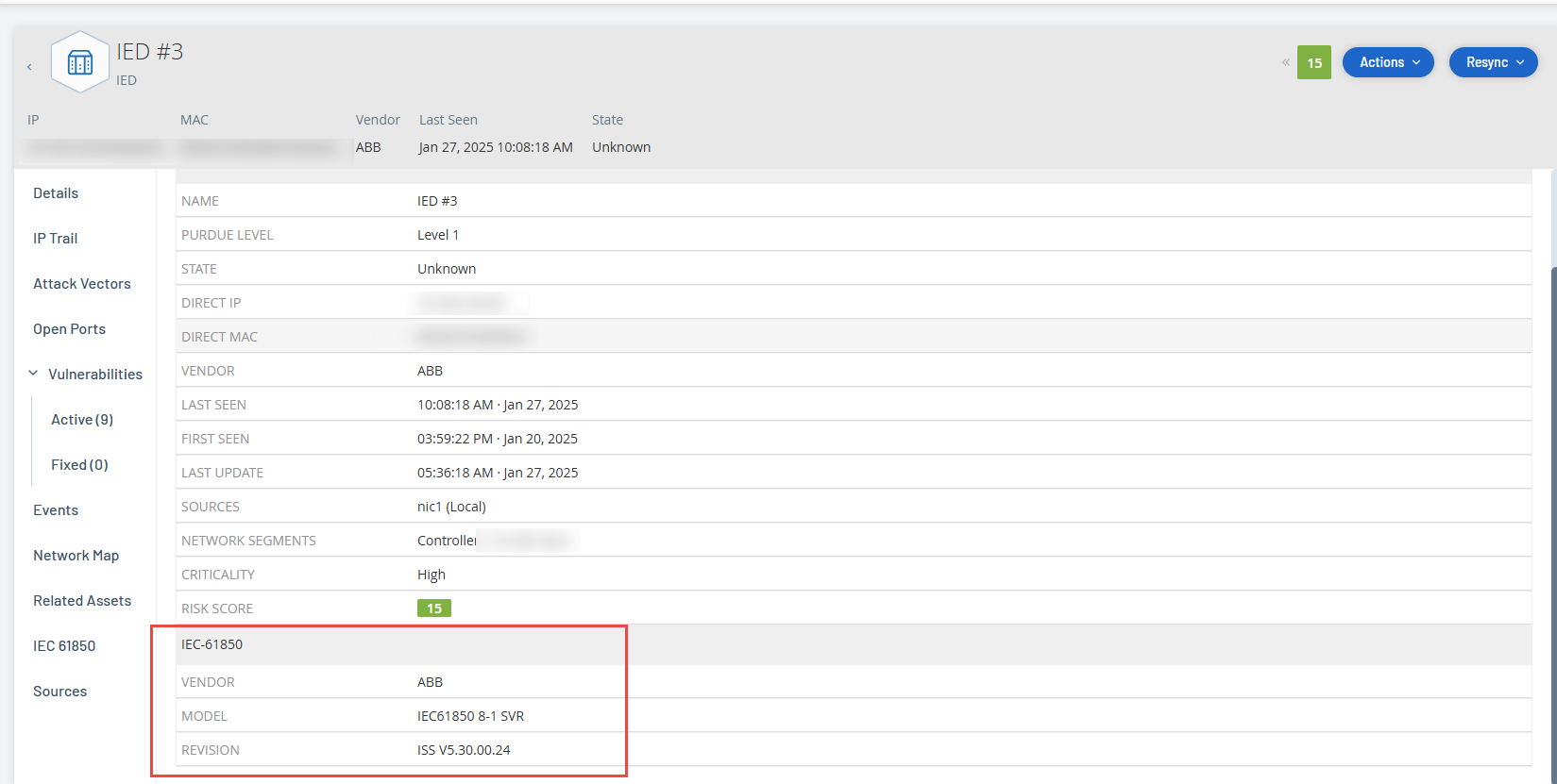 The IEC 61850 section on the Details page shows the following configuration for the specific IED asset.