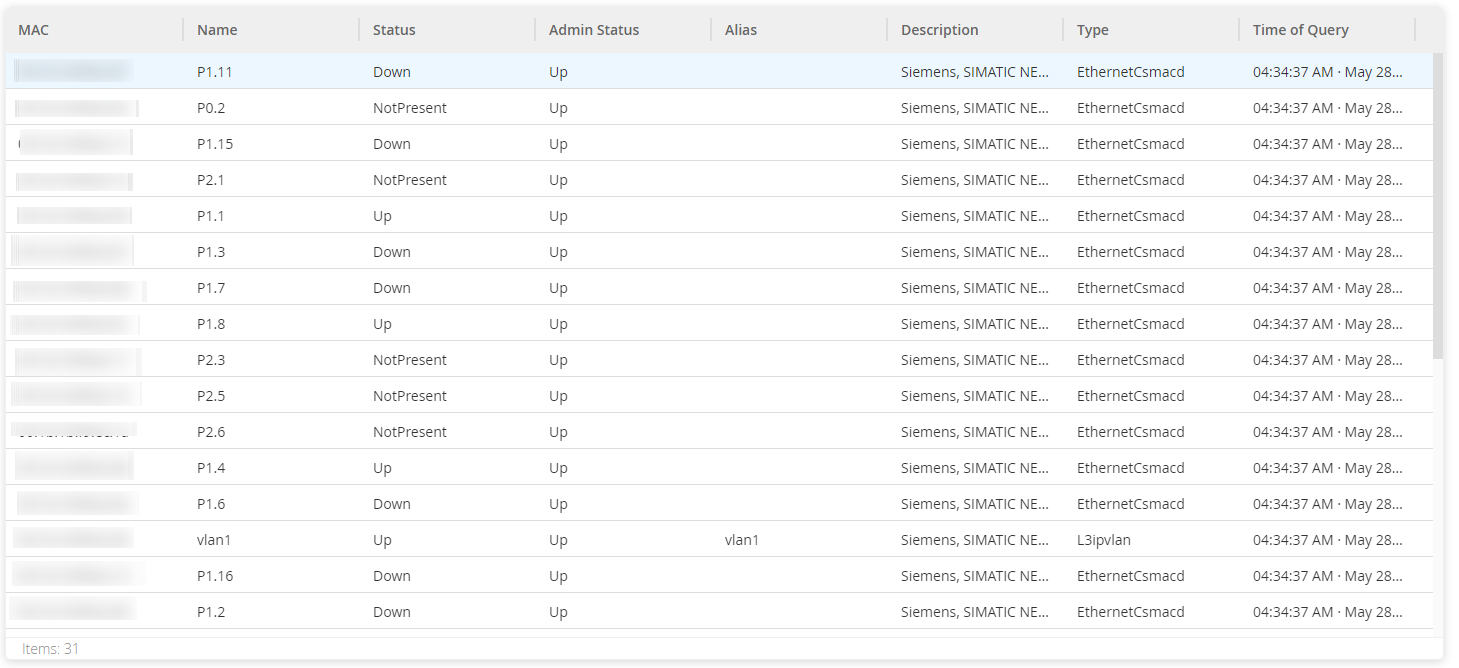 The Device Ports tab is available for network switches and includes details about the ports on the network switch. OT Security collects this data using SNMP queries to the switch. The details that appear for each port include the MAC address, Name, connection Status (up or down), Alias, and Description.