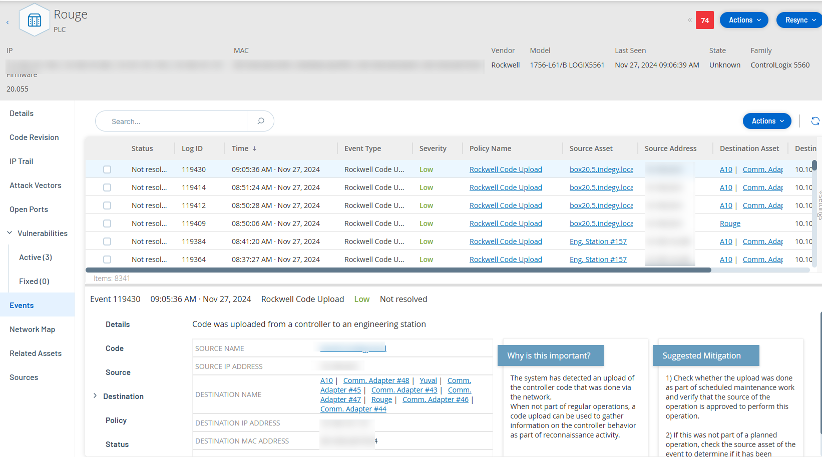 The Events tab displays a detailed list of Events in the network involving the asset, as detected by OT Security Plugins. You can customize the display settings by adjusting which columns are displayed and where each column is positioned. The events can be grouped according to different categories (for example Event type, Severity, Policy Name). You can also sort and filter the Event lists as well as searching for search text. For an explanation of the customization features, see Management Console User Interface Elements.