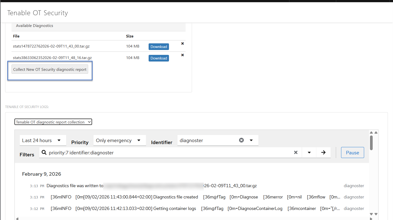 In the OT Diagnostics section, click Collect New OT Security Diagnostic Report.
