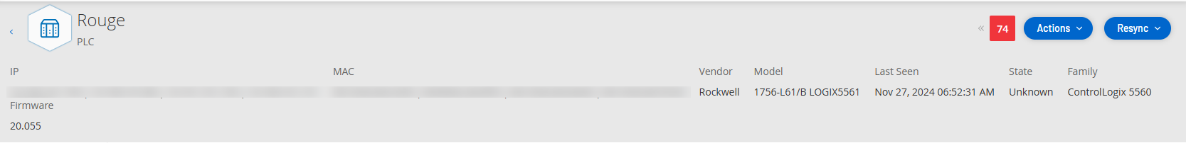 Asset Overview – shows essential info about the asset, including IP/s, Vendor, Family, Model, Firmware, and Last Seen (date and time).