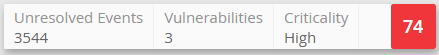 Risk Score Widget – shows the Risk score for the asset. The Risk score is an assessment (from 1 to 100) of the degree of threat posed to the asset. For an explanation of how the value is determined, see Risk Assessment. Click on the Risk Score indicator to show an expanded widget with a breakdown of the factors that contribute to assessing the Risk level (Unresolved Events, Vulnerabilities, and Criticality). Some of the elements are a link to the relevant screen that shows details about that element.