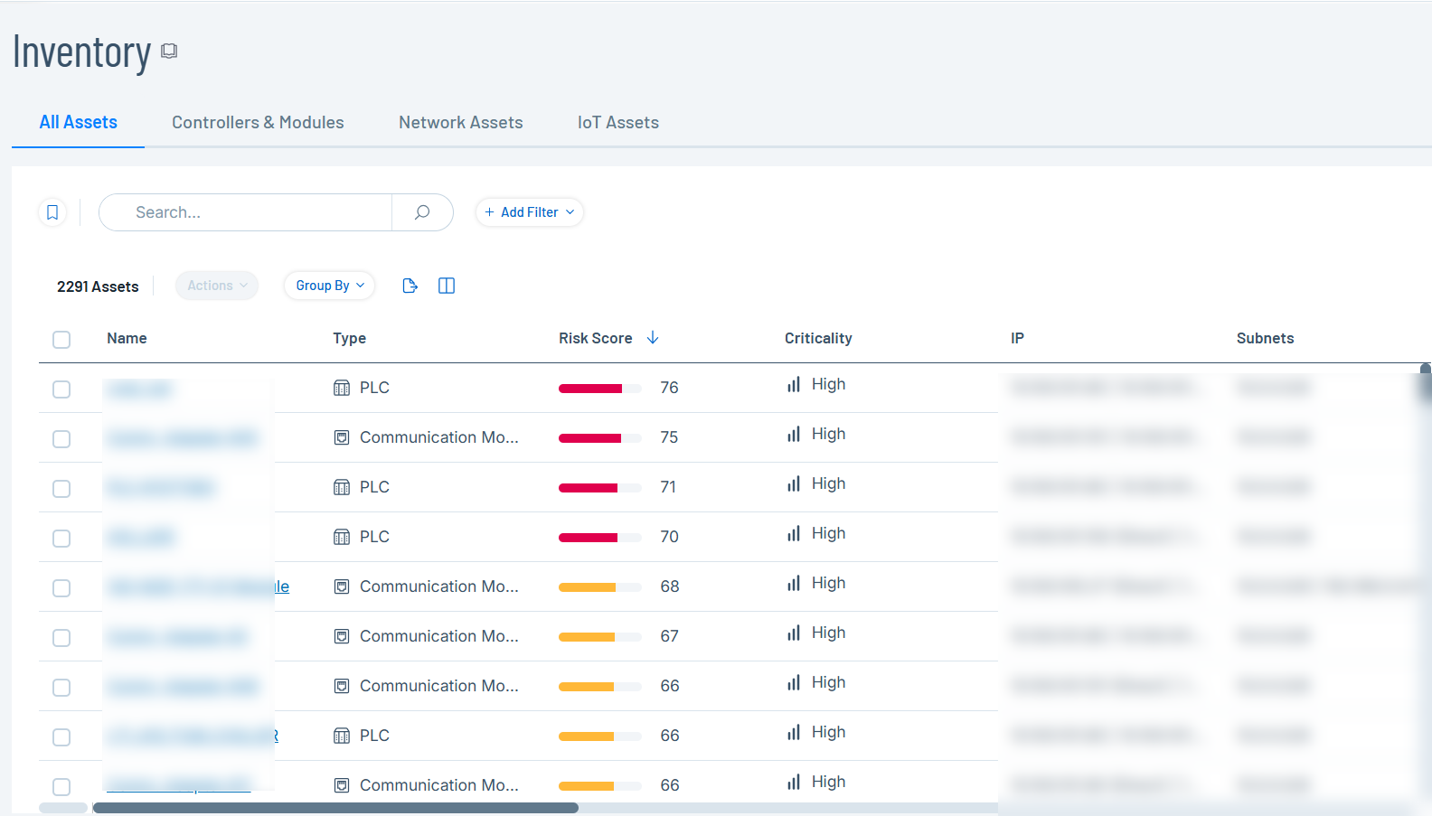 All the assets in the network appear on the Inventory pages. The Inventory page includes details about the asset that enables comprehensive asset management as well as monitoring of the status of each asset and its related events. OT Security collects this data using the Network Detection and Active Query capabilities. The All page shows data for all types of assets. In addition, specific subsets of the assets are shown on separate screens for each of the following asset types: Controllers and Modules, Network Assets, and IoT.