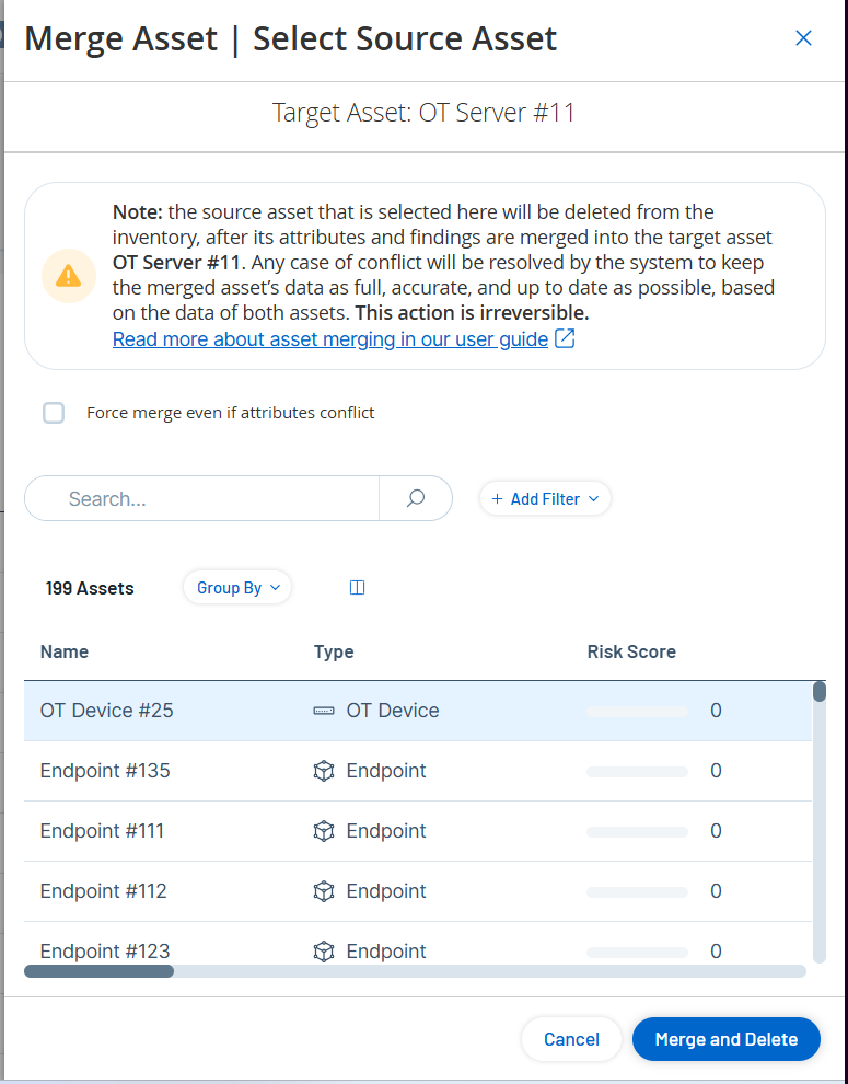OT Security deletes the source asset and merges its attributes and findings to the target asset.