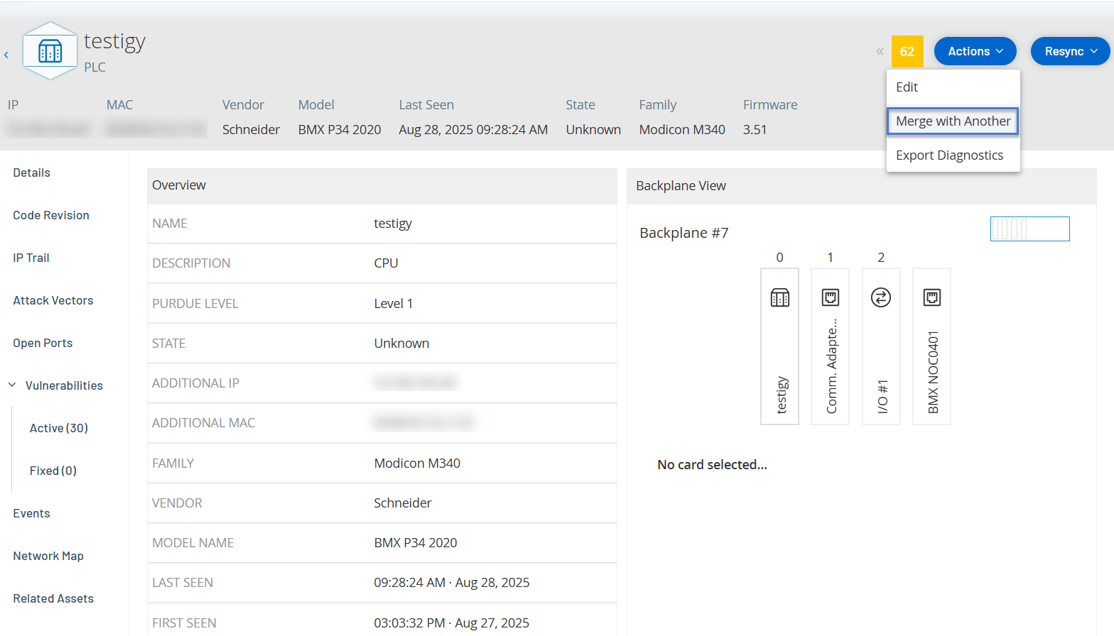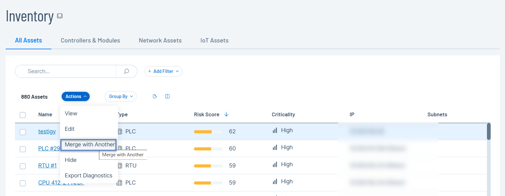 If an asset merge was performed in error, or you need to revert both assets to an unmerged state, delete the asset. Deleting it allows the system to rediscover the individual asset as they were before the merge. For information on how to delete a single asset or a group of assets from OT Security, see this knowledge base article.