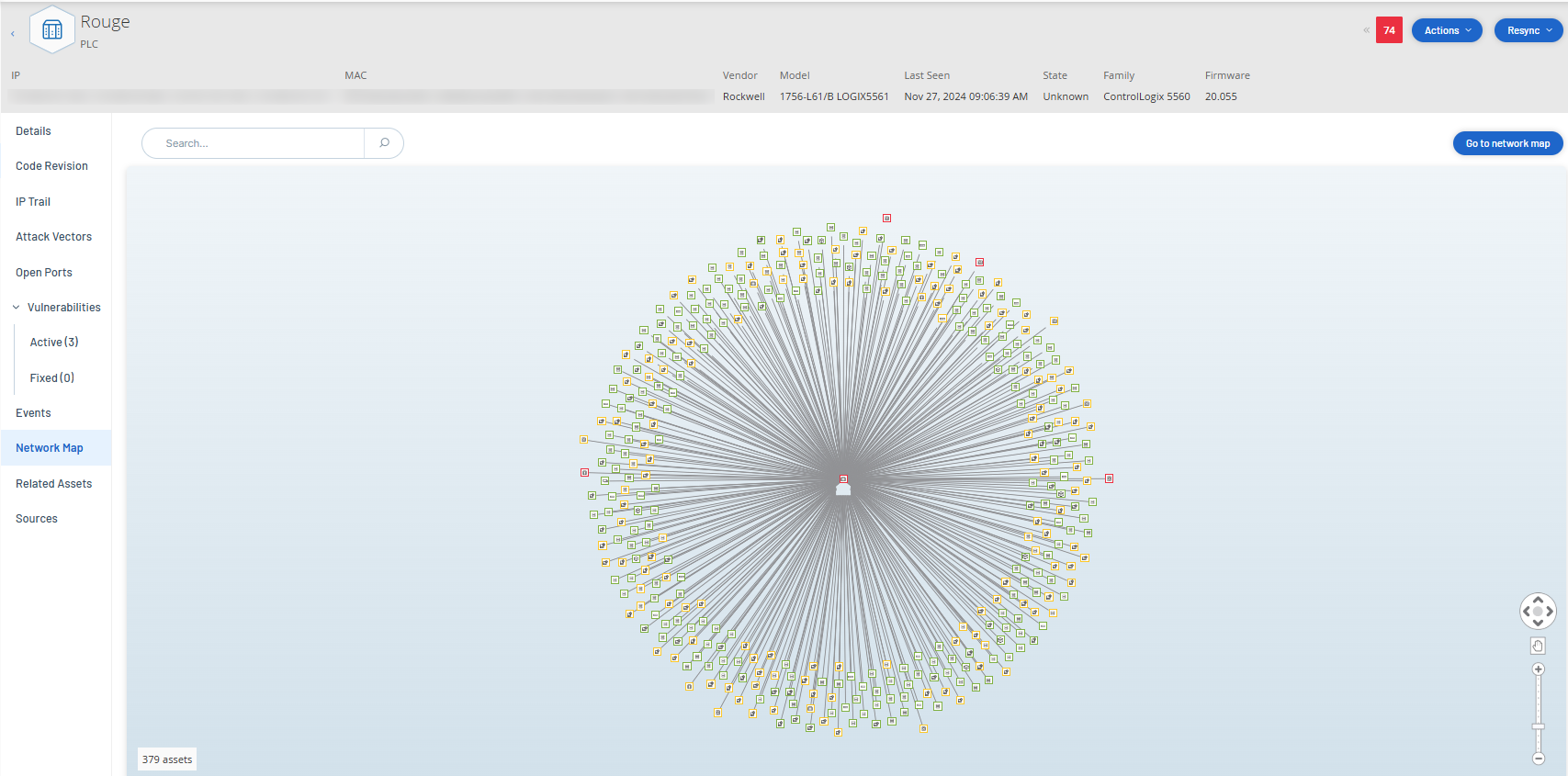 To view the Network Map for all assets, click the Go to network map button. When clicked, the Network Map will zoom in dynamically and focus on this asset and show its connections to other groups of assets.