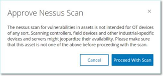 Tenable Nessus is a tool that scans IT devices to detect vulnerabilities. OT Security enables you to run the Tenable Nessus Basic Network Scan on specific IT assets within your OT network. This is an active full system scan that gathers additional information about vulnerabilities on the servers and network devices. This scan uses the WMI and SNMP credentials, if they are available. This action is only available for relevant PC-based machines. You can access the scan results from the Vulnerabilities page. You can also create customized scans to run a specific set of Tenable Nessus Plugins on a particular set of network assets, see Tenable Nessus Plugin Scans.
