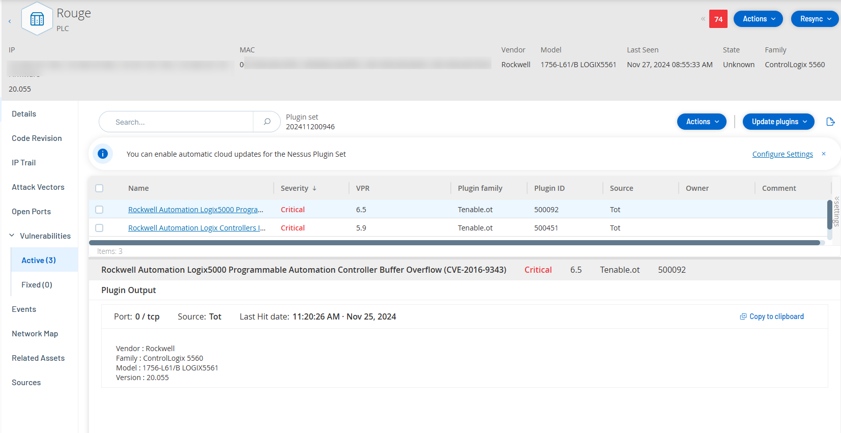 The Vulnerabilities tab shows a list of all vulnerabilities that affect the specified asset, as detected by OT Security Plugins. The system identifies vulnerabilities such as obsolete Windows operating systems, usage of vulnerable protocols and open communications ports which are known to be risky or non-essential for specific types of devices. The vulnerabilities are listed in two categories: Active and Fixed. Each listing shows details about the nature of the threat and its severity. The information shown in this tab is identical to the information shown on the