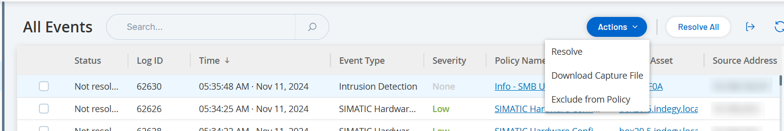 Each screen has a series of actions that you can take for the elements on the screen. For example, in the Policies screen, you can View, Edit, Duplicate or Delete a Policy. In the Events screen, you can Resolve or Download Capture File for an event.