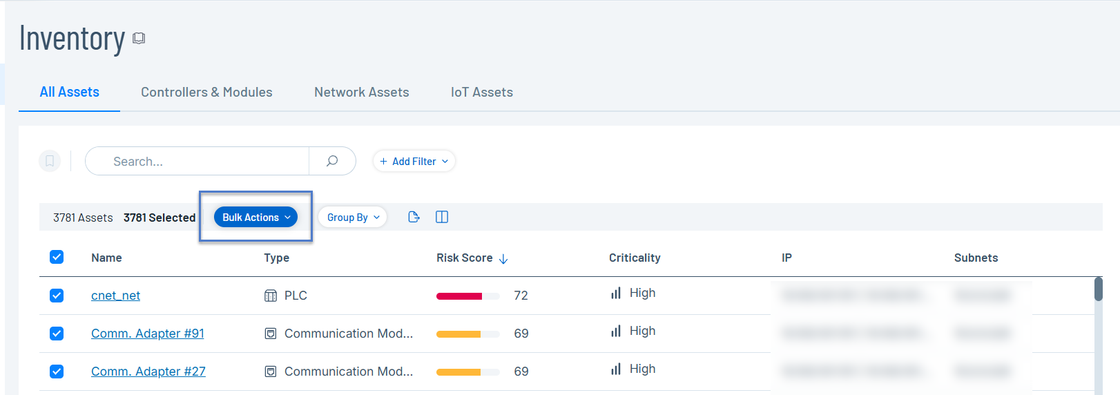 When you select multiple elements on a page, OT Security enables the Bulk Actions option in the header.
