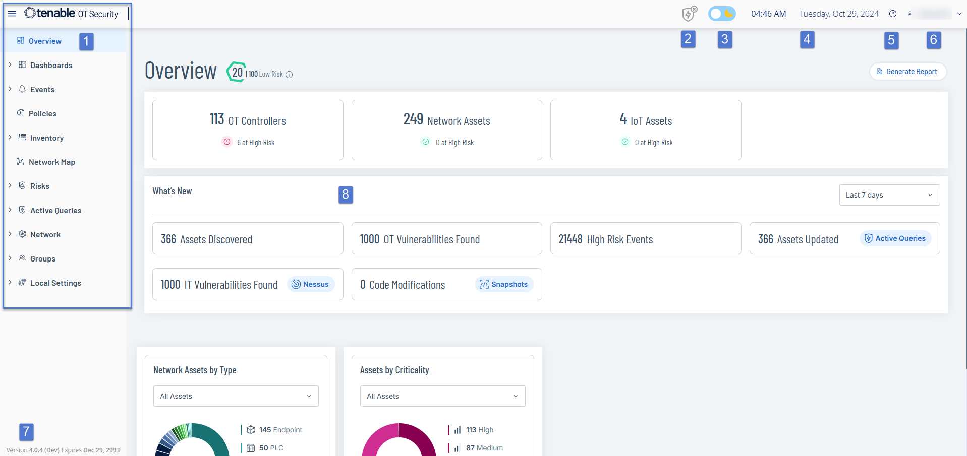 • Overview — Shows widgets that give a general view of your network’s inventory and security posture. See OT Security Overview.