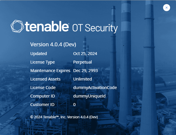 After activating OT Security, you can view your Tenable customer ID in the About view. This customer ID is required when contacting Technical Support or Customer Success teams.
