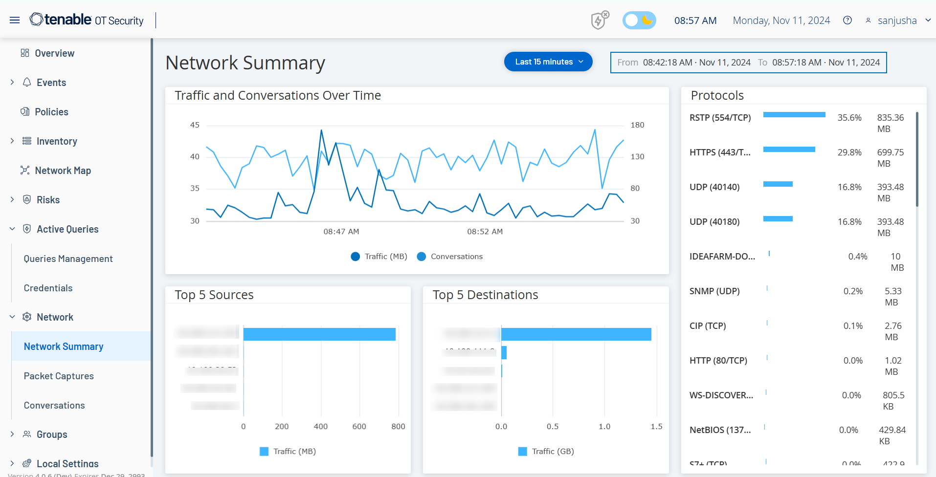 Conversations — Shows a list of all conversations detected in the network, with details about the time they occurred, and involved assets. See Conversations