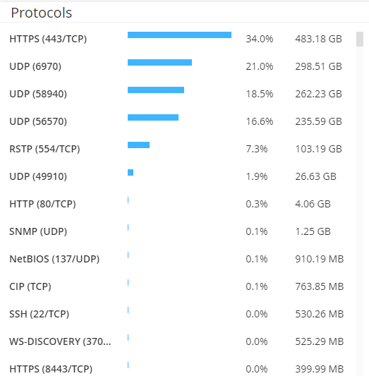 The Protocols widget shows data about the usage of various protocols for communication within the network during a specific timeframe.