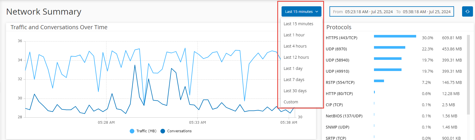 The Network Summary page displays data that represent network activity during a specific timeframe. The header bar shows the range of time for the current data display. The default timeframe is for the Last 15 minutes. The header bar also shows the Start and End time of the timeframe.