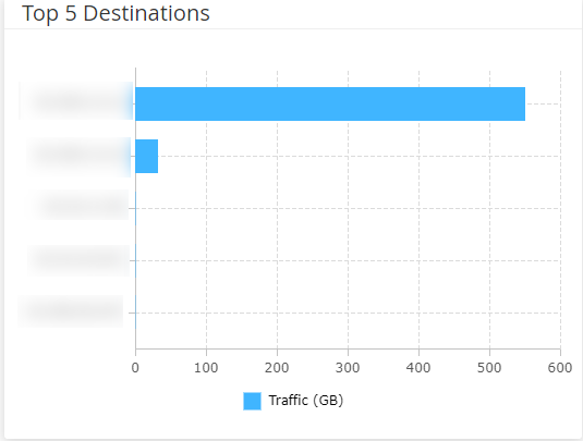 The Top 5 Destinations widget shows the number of conversations and amount of traffic for each of the top five assets that received communications through the network during the specific timeframe. You can identify the destination assets by their IP addresses. Hover over a bar graph to see the number of conversations and volume of traffic that the asset received.