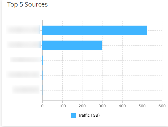 The Top 5 Sources widget shows the number of conversations and the volume of traffic for each of the top five assets that sent communications through the network during a specific timeframe. You can identify the source assets by their IP addresses. Hover over a bar graph to see the number of conversations and volume of traffic coming from that asset.