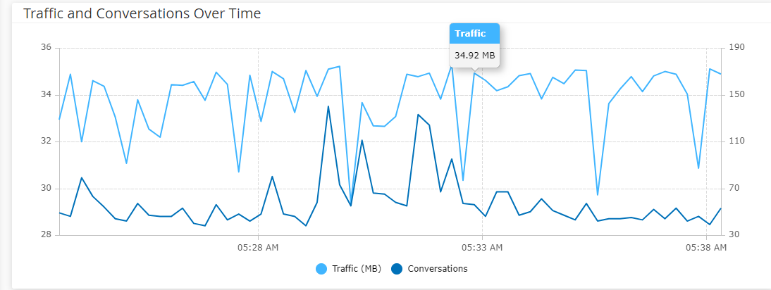 A line graph displays the volume of traffic (measured in KB/MB/GB) and the number of conversations in the network over time. The legend key appears at the top of the graph. Hover over a point on the graph to display specific data about the traffic and conversations during that time segment.
