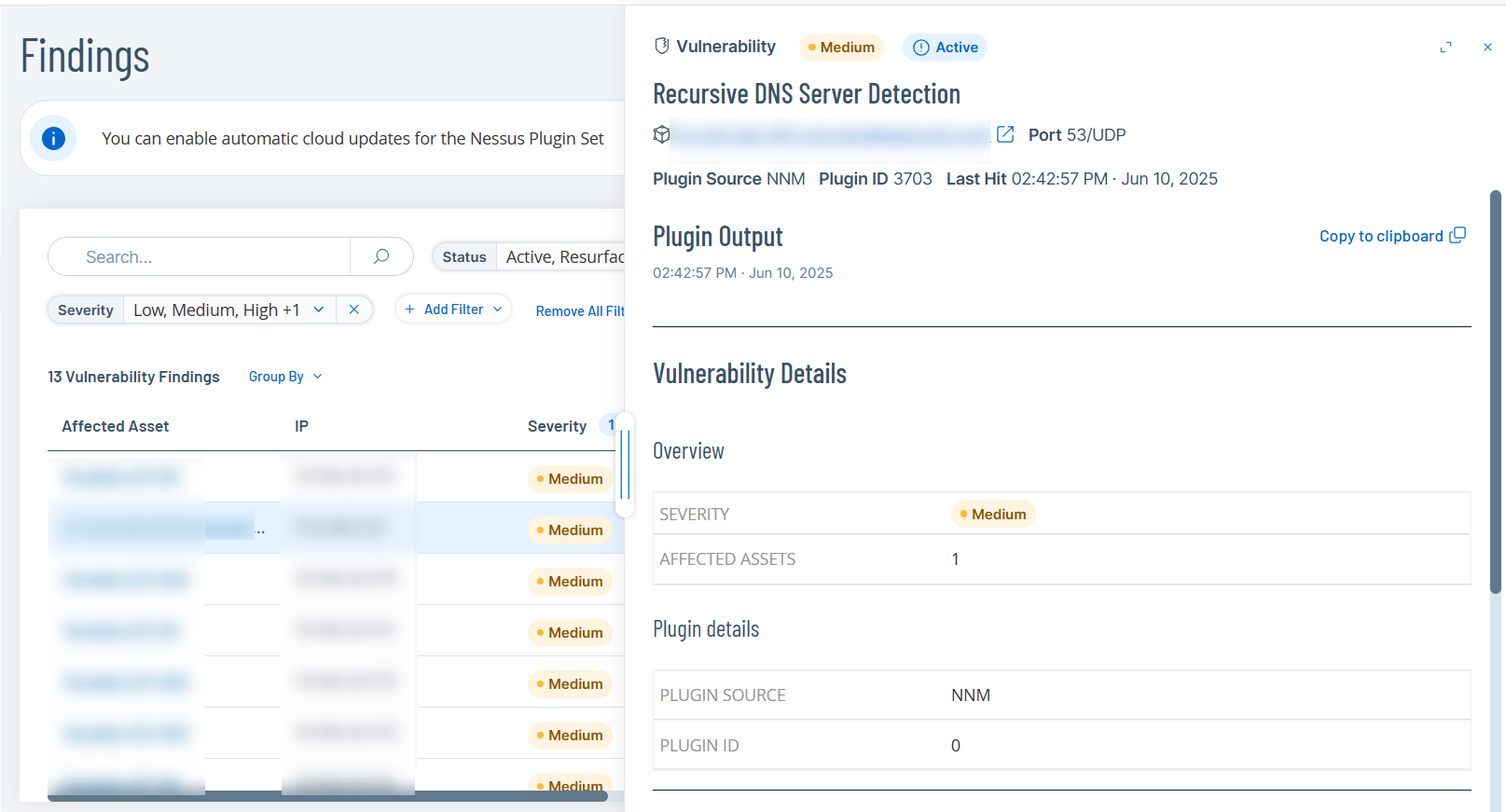 On the Findings page, click the link in the Affected Assets or the Plugin Name column.
