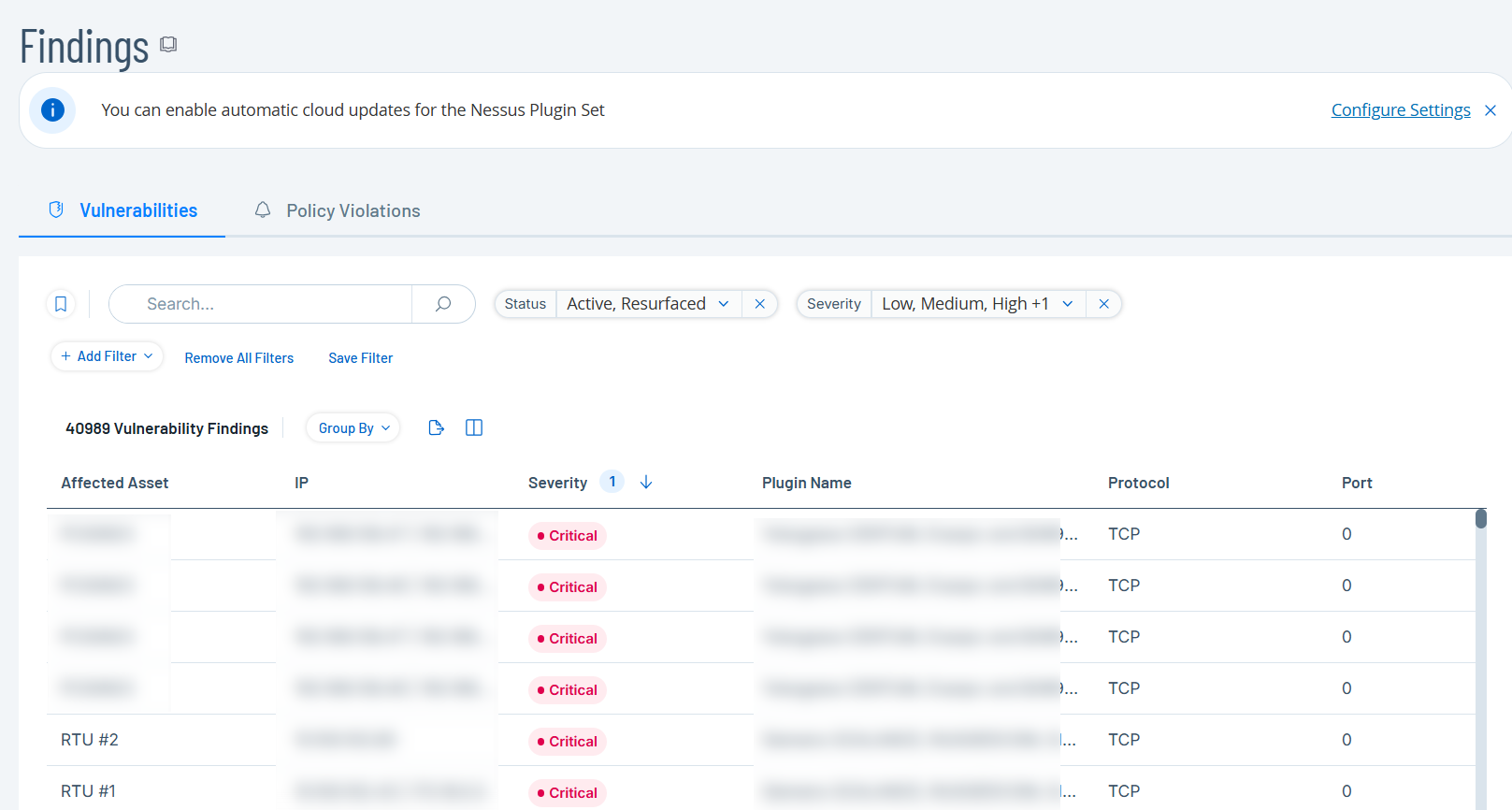 Plugin Source The plugin source. First Hit The time when the vulnerability was first detected. Last Hit The time when the vulnerability was last detected. Asset Tags The tags associated with the asset. See Asset Tags & Groups. Fixed at The time when the vulnerability was remediated. Plugin Family The family of the plugin. Asset Type The asset type, such as PLC and OT device. Asset Risk Score The risk score of the asset. Asset Category The category to which the asset belongs to, such as Controller, Network Assets. Asset Vendor The name of the vendor of the asset. Asset Criticality The criticality of the asset based on the severity of the vulnerability: High Criticality, Medium Criticality, or Low Criticality. Asset Family The family of the asset. Asset Model The model of the asset. Firmware The firmware of the asset. OS The operating system that the asset runs on. Asset State The current state of the asset. Purdue Level The purdue level of the asset. Network Segment The network segment that the asset belongs to. Location The asset's location. Backplane Name The name of the backplane where the vulnerability was detected.