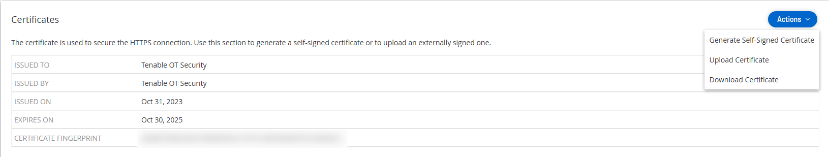 The HTTPS certificate ensures the system is using a secure connection to the OT Security appliance and server. The initial certificate ages out after two years. You can generate a new self-signed certificate at any time. The new certificate is valid for one year.