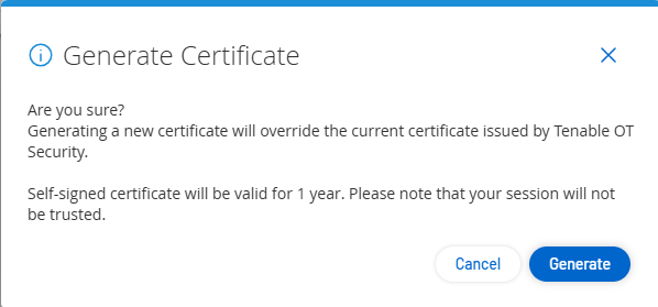 Note: After replacing the certificate, Tenable recommends that you reload the browser tab to ensure the HTTP Certificate update is successful. If the upload is unsuccessful, OT Security displays a warning message.