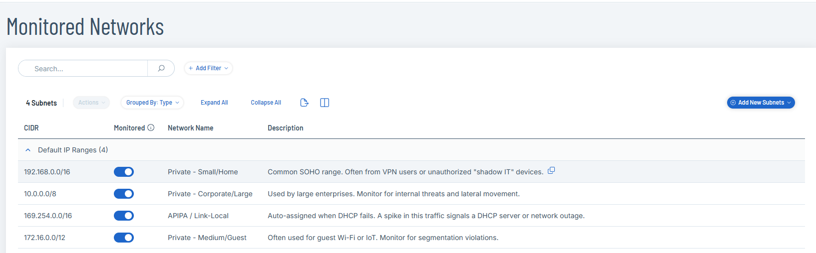 Note: The Monitored toggle is enabled by default. To turn off monitoring, click to disable the Monitored (All Added Subnets) toggle. -