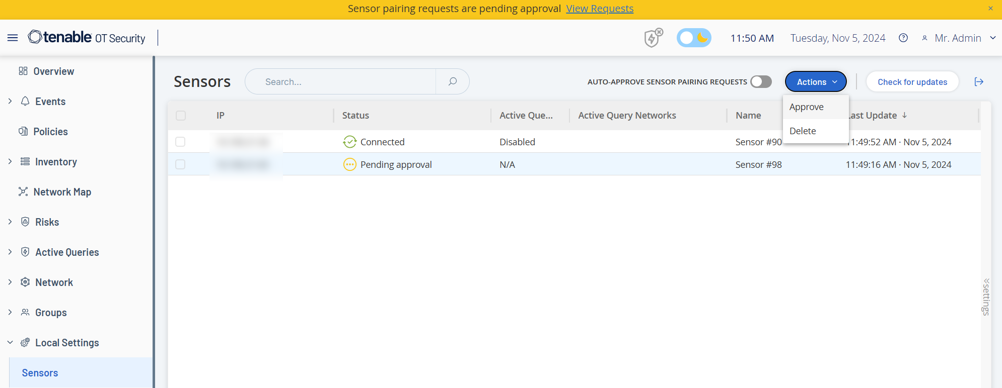 If the Auto-Approve Sensor Pairing Requests setting is toggled to OFF, incoming sensor pairing requests must be manually approved before they are successfully connected.