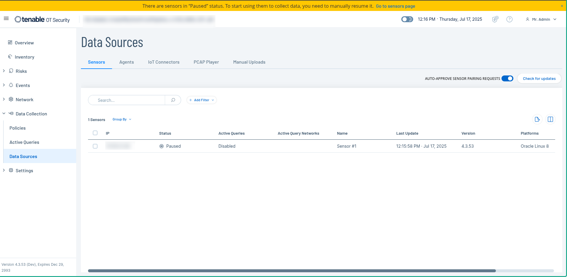 After sensors are paired using the Tenable Core user interface, you can approve new pairings, view, and manage sensors using the Edit, Pause, and Delete functions in the Actions menu. You can also choose to enable automatic approval for sensor pairing requests using the Auto Approve Sensor Pairing Requests toggle.