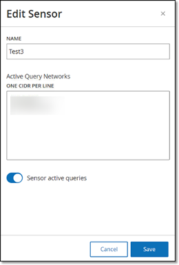 Note: Queries can only be performed on CIDRs that are included in the monitored network ranges. Make sure to add only CIDRs that are accessible through this Sensor. Adding CIDRs that are not accessible may interfere with the ICP's ability to query those segments by other means.Note: If the sensor is part of a duplicated network, the duplicated network IP address appears in the Active Query Networks box and is disabled for editing. -