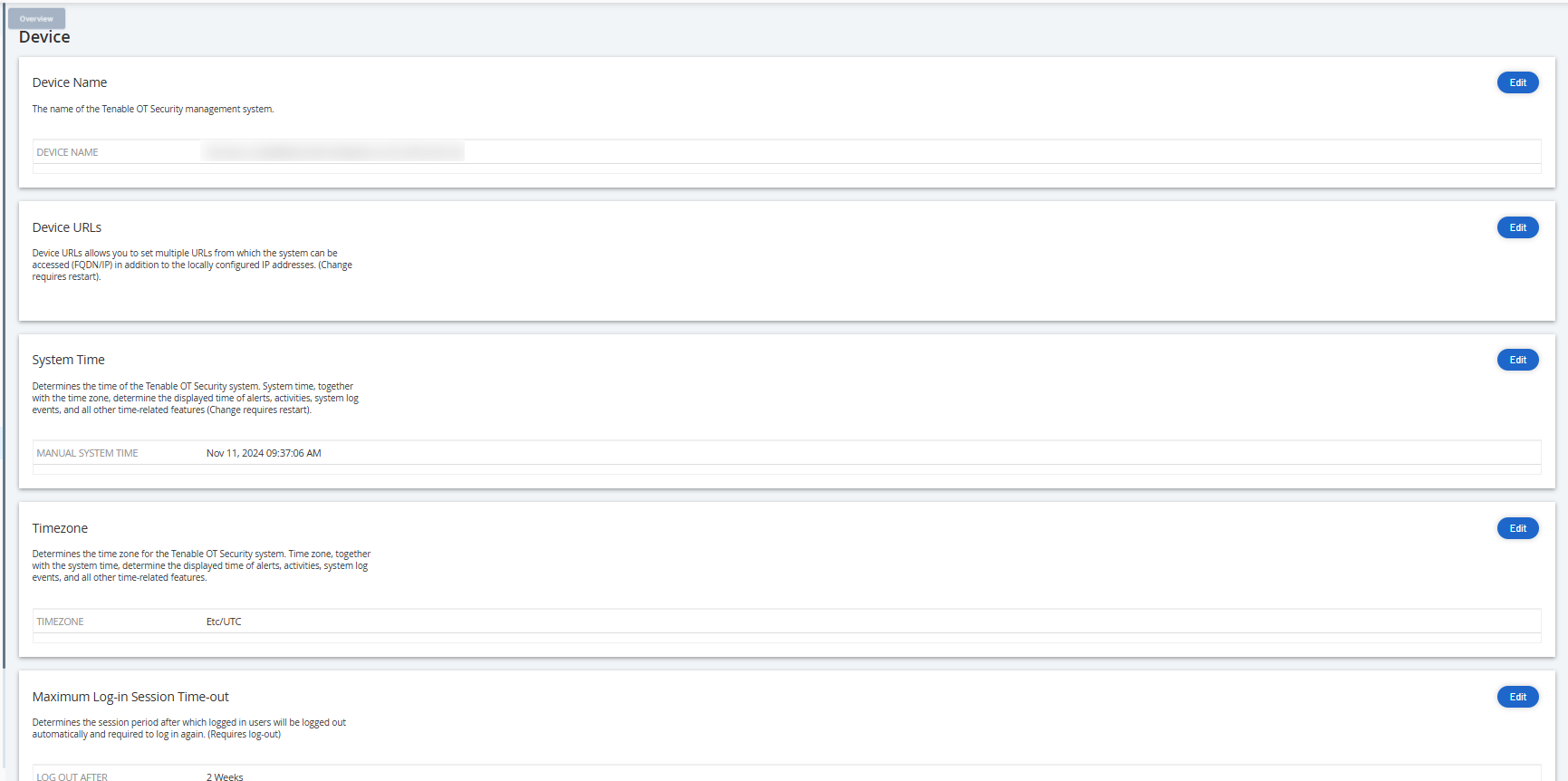 The Device page shows detailed information about your OT Security configuration. You can view and edit the configuration in this page.