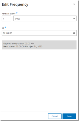 In the At section, set the time of day for the DFE update (in HH:MM:SS) by clicking the clock icon and selecting the time, or by entering the time manually.