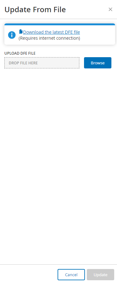 If you do not have an internet connection on your OT Security device, you can manually update DFE by downloading the latest version from the Tenable Customer Portal and uploading the file.