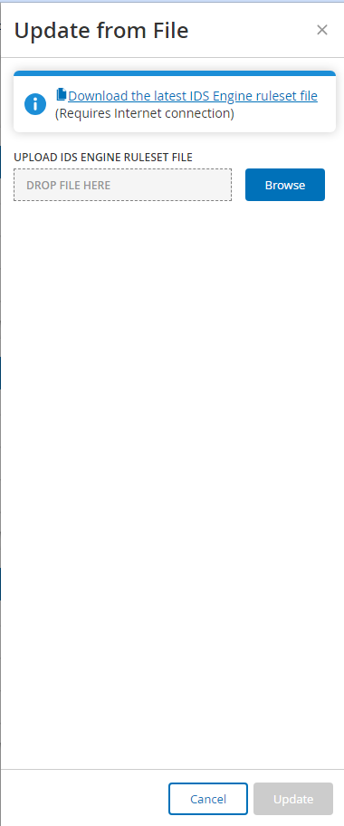 Note: Downloading the latest IDS Engine ruleset file from the link is only possible through an internet connection, such as with an internet-connected PC.Click Browse and navigate to the IDS Engine ruleset file you downloaded from the OT Security Customer portal.