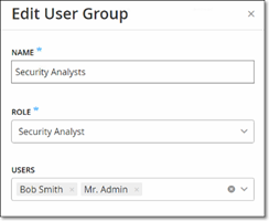 An administrator user can create new User Groups and edit existing groups. Each user is assigned to one or more User Groups, which determine the roles assigned to the user.