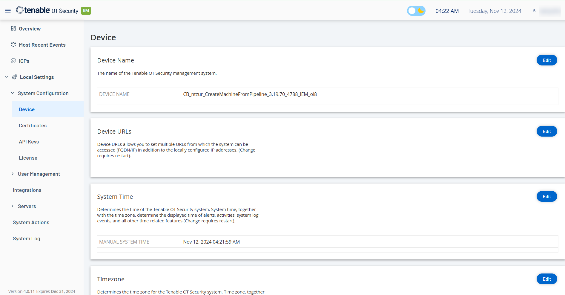 | Device URL | The URL used to access the OT Security EM console in a DNS environment. |