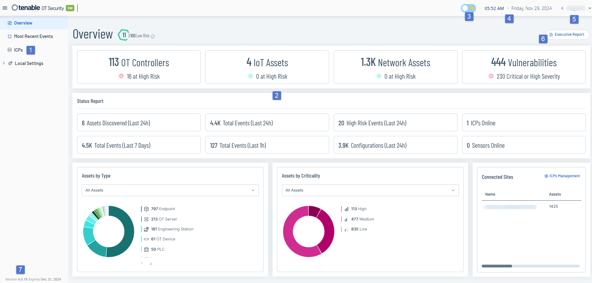 Overview — View widgets that give an at-a-glance view of your entire enterprise’s inventory and security posture based on the aggregated data from your sites. See OT Security EM Overview