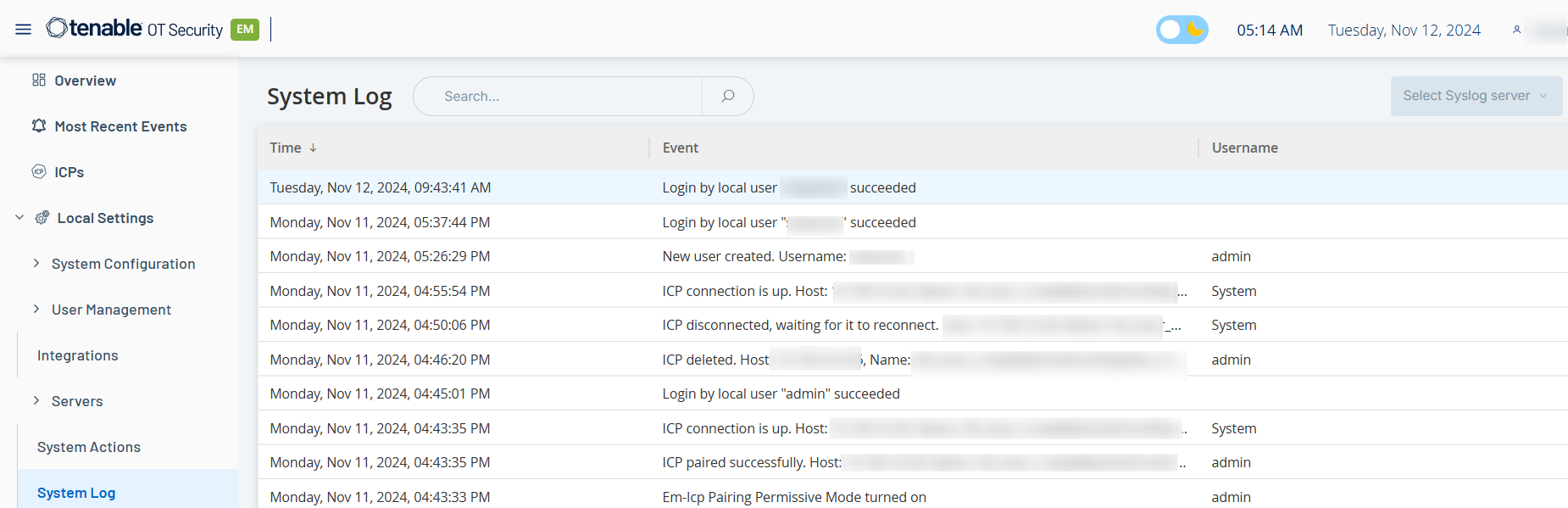 The System Log page shows a list of all the system events that occurred in the system, such as Policy turned on, Policy edited, and Event Resolved. This log includes both user-initiated events as well as automatically occurring system events (for example, Policy turned off automatically because of too many hits). This log does not include policy-generated events (which are shown on the Events page). You can export the logs as a CSV file. You can also configure the system to send the System Log events to a Syslog server.